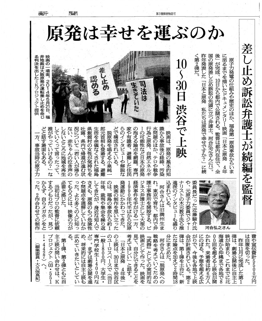 「原発で幸せを運ぶのかー差し止め訴訟弁護士が続編を監督」大久保真紀編集委員、朝日新聞朝刊、10/7/2015